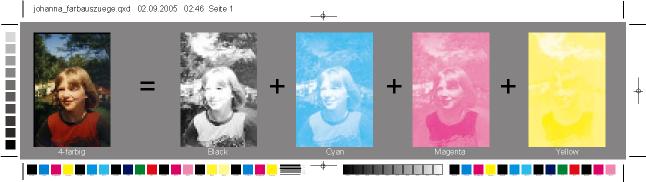 Das gedruckte Bild setzt sich aus diesen 4 Grundfarben zusammen, das durch die gerasterte Zusammensetzung im Druckprozeß als farbig wahrgenommen wird.